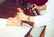 behandelden Hautregionen gesprüht. Durch diese intensive Kältebehandlung